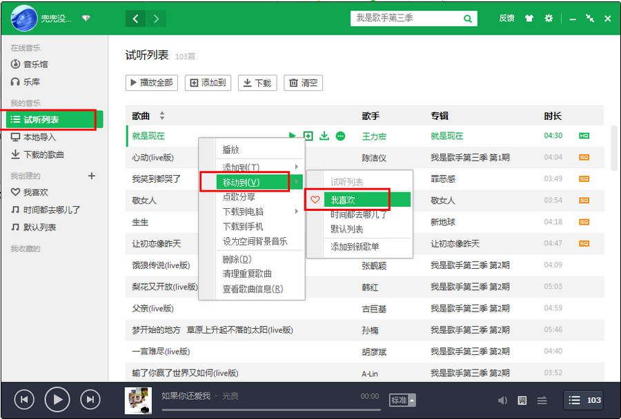 4、在我喜欢的页面里,可以直接看自己收藏的歌曲,这样歌就不用移来移去。