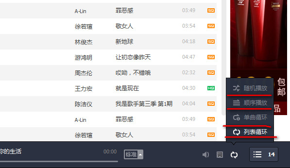 2、我们可以看到它的播放方式有四种单曲循环、随机播放、顺序播放、列表循环,大家可以选择你想要的播放方式