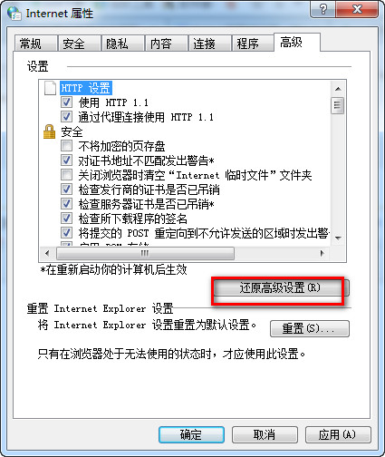 2、还原浏览器高级设置:工具→INTERNET选项→高级→还原默认设置。不想还原默认设置请保持第一条的设置不变。