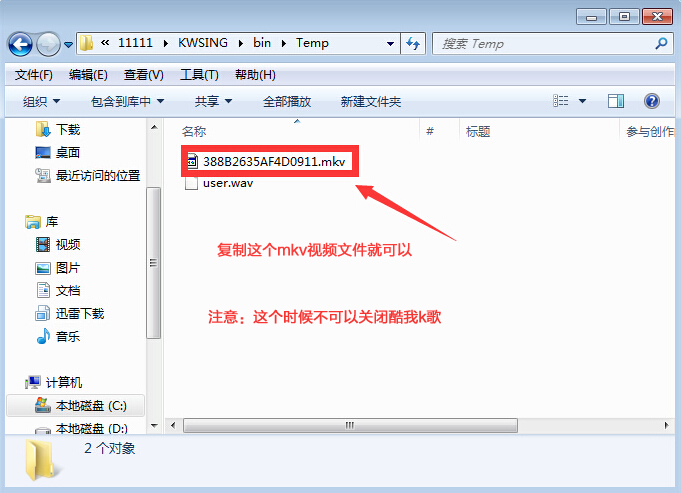 5.找到Temp文件夹 打开它,复制这个mkv视频文件就可以。(注意:这个时候不可以关闭酷我k歌)