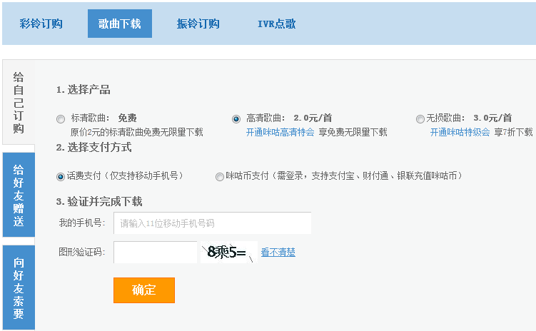 2.在订购页面中输入手机号、图形验证码。获取短信验证码并输入,点击确定,完成彩铃订购。