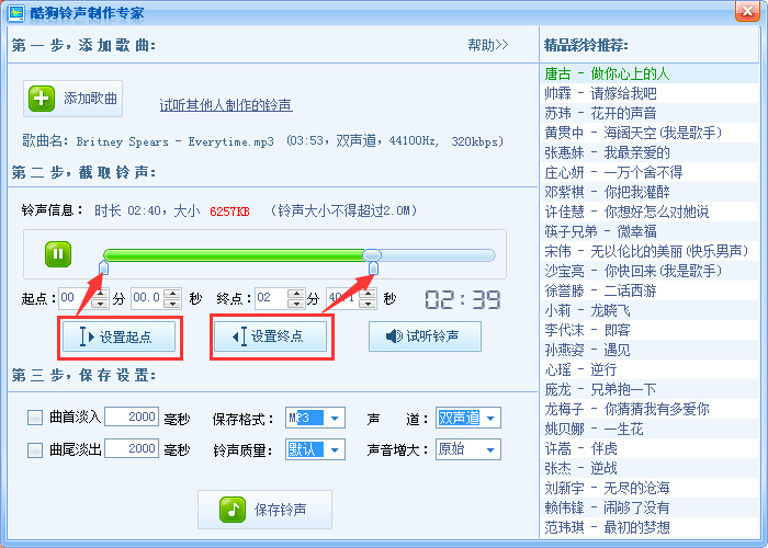 2.进入铃声制作页面,就可以发挥你的所长了,跟很多的音乐编辑工具差不多。最重要的设置开始和结束时间,可以鼠标点击,也可以设定时间。同时还有其他很多设置,我就不一一介绍,你可以去自己尝试就可以了。同时,还可以试听。如图。