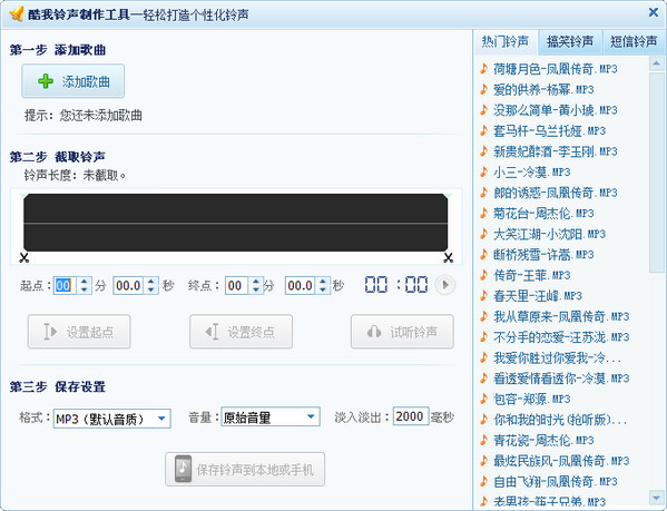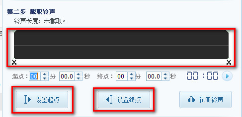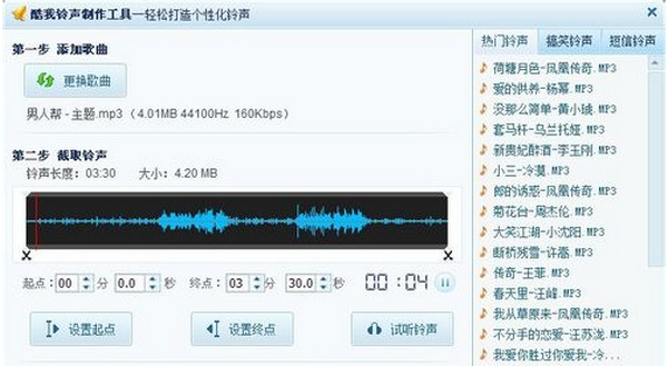 第四步:缓冲完以后你就可以看到铃声制作的界面了,(这个工具现在是酷我音乐盒自带的,带也有下载[ 酷我铃声制作工具2.0绿色免费版 ])看到这个界面应该大家都会了吧