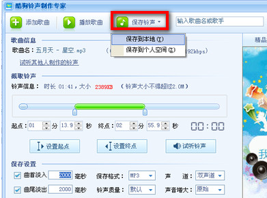 第七步:然后点击上面的保存铃声(这里选择保存到本地)等待保存完毕。