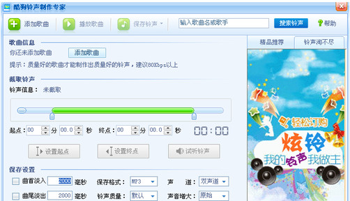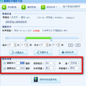 第六步:在保存设置那里我们可以选择曲首淡入和曲尾淡出。(选择这两个选项。第一个可以可以让曲首播放比较自然不会进入就很大的声音,曲尾淡出是设置歌曲播放要完成时有一个过度)当铃音的话就不要选了。