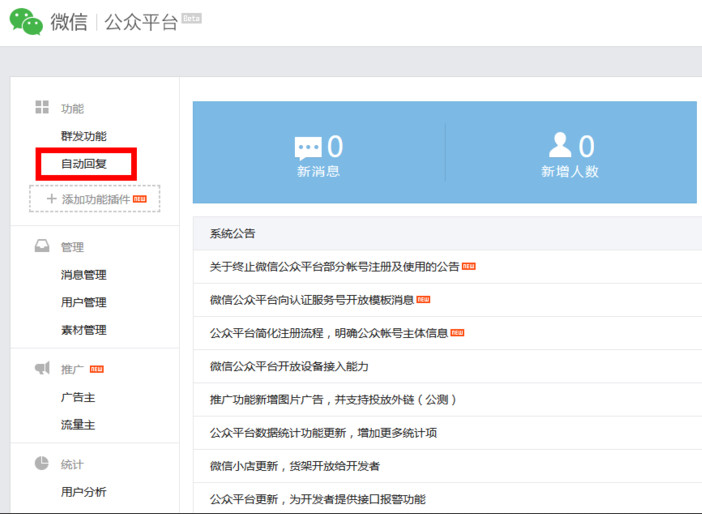 步骤七:登录订阅号后,找到并点击“自动回复”功能;