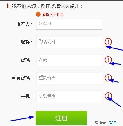 步骤四:推荐人填写 56559 以及填写其他相关信息注册账号;保存好微店号,接下来会用到的