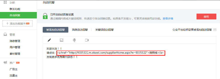 步骤九:在“消息自动回复”一栏也可以填入上步骤的连接;其他文字都可以修改,加上自己的产品广告语宣传更有效果;
