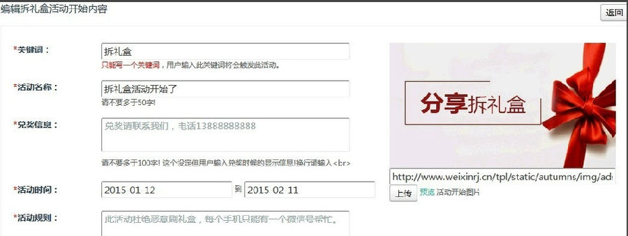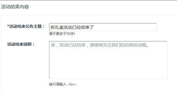 4、然后大家就可以开始填写里面的礼盒内容,填写活动结束内容,包括公告主题,封面图片等。