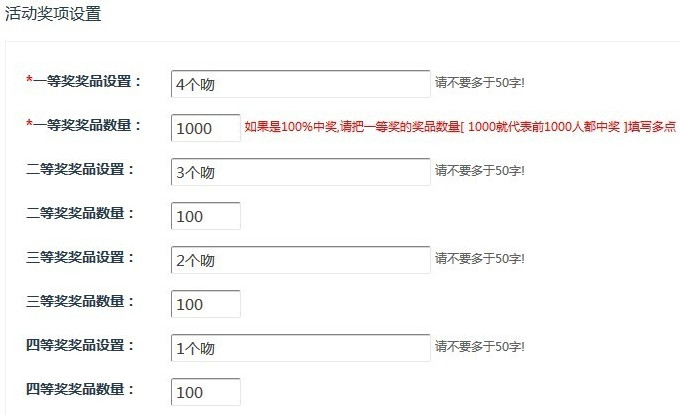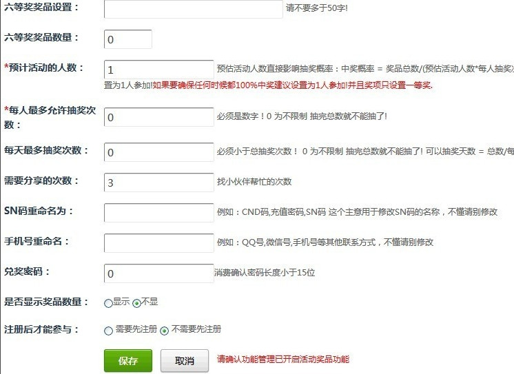 5、填写奖项设置,注意红色的提示语,SN码,手机号等不懂可以空着不填。