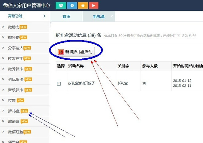 3、这个时候进入了制作页面点击“新增拆礼盒活动”进入到填写位置