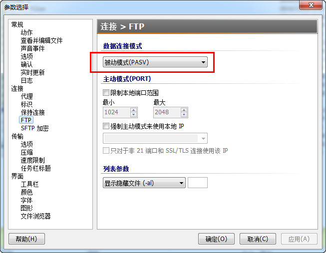 2、左侧选择”连接“下的“FTP”,连接模式选择“被动模式(PASV)”,点击“确定”退出设置