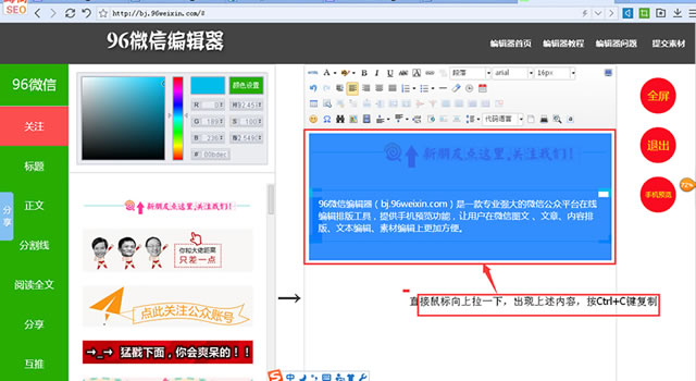 第六、出现蓝色的,大家可以用Ctrl+C键直接复制就行了,复制到微信公众平台素材编辑框里面就了,