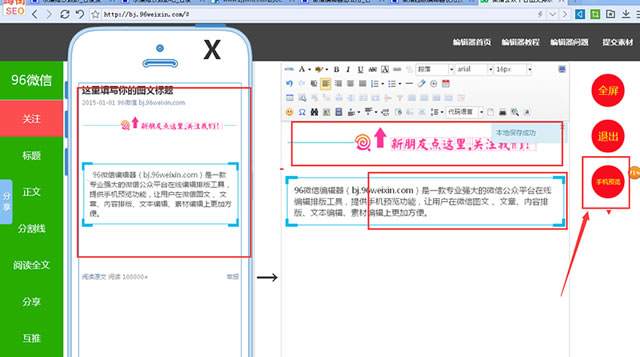 96微信编辑器(http://bj.96weixin.com/)是一款专业强大的微信公众平台在线编辑排版工具,提供手机预览功能,让用户在微信图文 、文章、内容排版、文本编辑、素材编辑上更加方便。