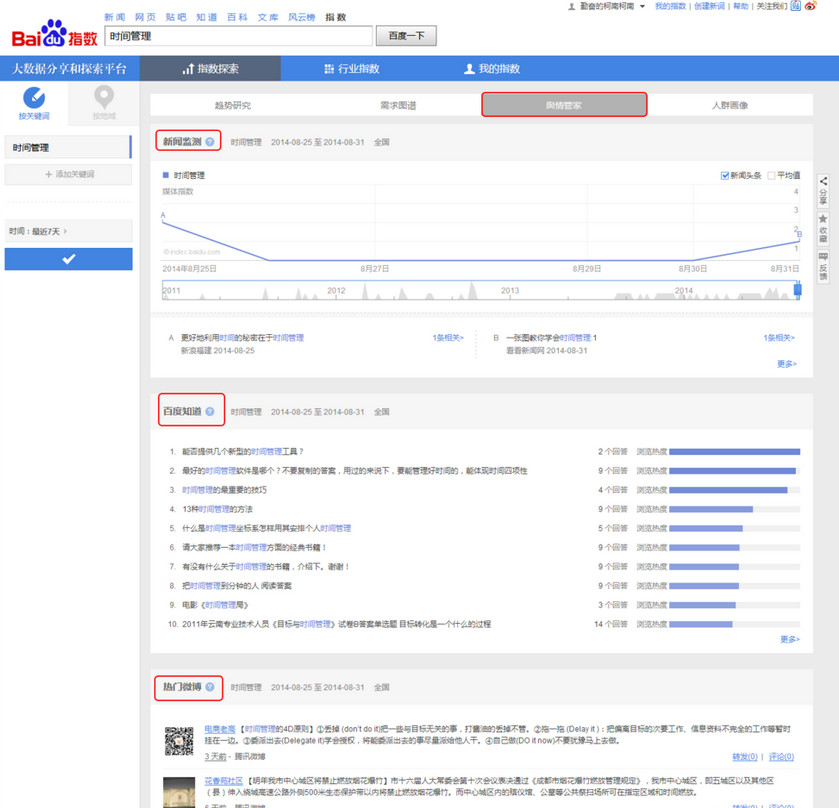 5、“舆情管家”,分为“新闻监测”、“百度知道”和“热门微博”三个分类。大家可以通过“舆情管家”查看关于“时间管理”一词的相关热点