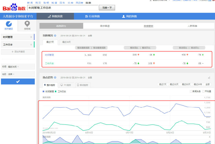 3、如果你需要对比两个词的热度,可以在“时间管理”下面添加另一个词进行对比。这样另一个词的“指点概况”、“热点趋势”和“媒体指数”也会出来并和“时间管理”一词进行对比。