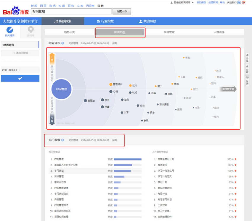 4、“时间管理”的趋势研究图,下面是“需求图谱”,有“需求分布”和“热门搜索”两个维度。用户可以依据图标查看相关需求和相关关键词。