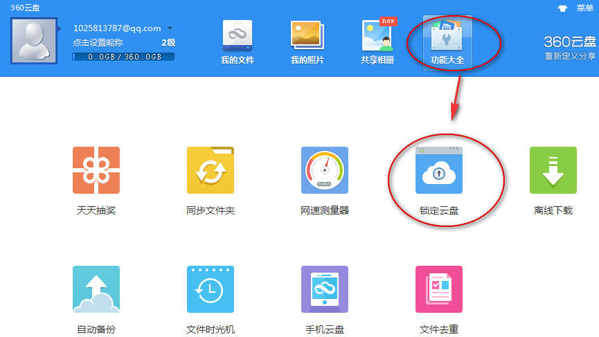1、锁定360云盘主要是当自己离开操作时,可以锁定360云盘,以防信息泄露,具体操作是,首先登陆360云盘,然后点击功能大全。