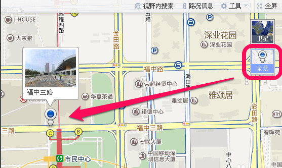 2、进入地图页面后,进入我们的城市,然后在右上角的卫星地图切换图标下面都了一个全景的图标