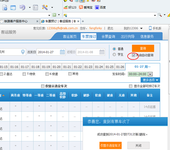 g) 系统忙时输完验证码后会卡死一会,不要管,只能等,12306网站返回数据后就活过来了。