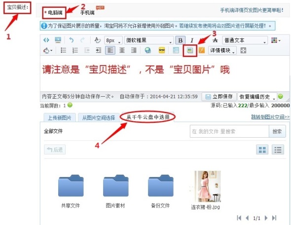 要求:在卖家中心发布宝贝,从云盘中选择图片上传并发布宝贝,奖励250G