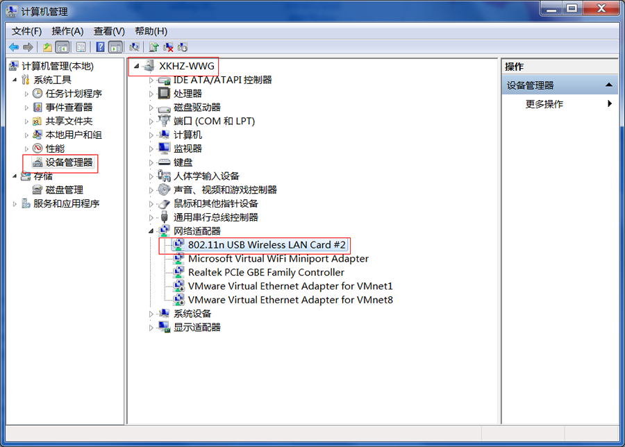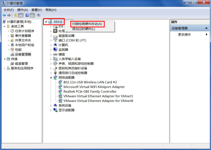 计算机—右击——管理—设备管理器—网络适配器—选中你的无线网卡(wireless LAN)右击卸载,如图“卸载无线网卡”(不要打勾)—直接确定—鼠标选中计算机名(XKHZ-WWG)扫描检测硬件改动如图“扫描硬件”需要耐心等待几分钟系统会自动安装无线网卡,安装完成之后就可以打开软件正常使用软件。