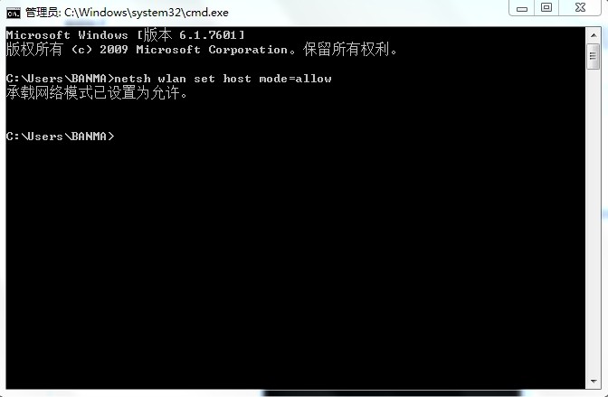 输入“netsh wlan set host mode=allow”, 按回车,出现如下图所示的提示: