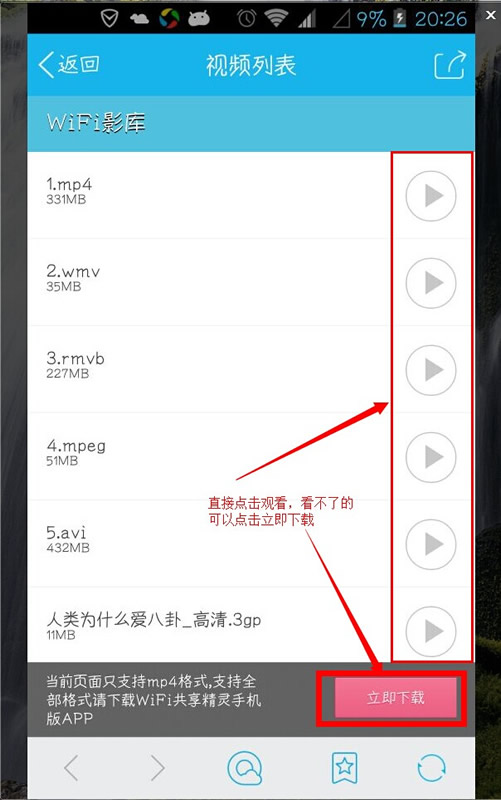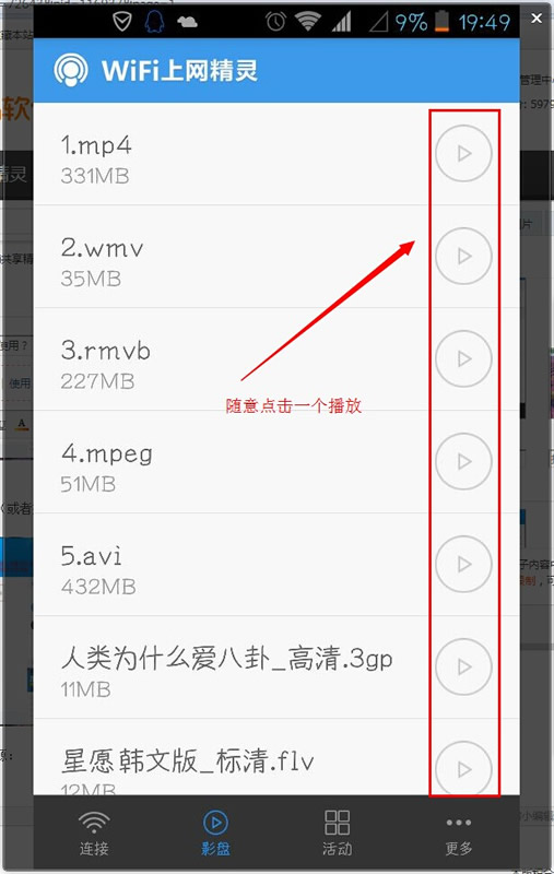 手机下载WiFi上网精灵-----电脑上成功开启免费WIFI后,选择有资源的文件夹(小资源、电影、歌曲)-----启动影库-----打开手机里上网精灵的影盘(或者扫描二维码或手机浏览器输入)-----直接观看各种视频小资源。