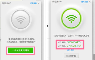 步骤四:在弹出的360连我wifi界面点击“一键创建无线网络”,这时等待360自动创建无线网络,创建成功后,根据360连我wifi提供的账号密码,你就可以连接无线网络使用了