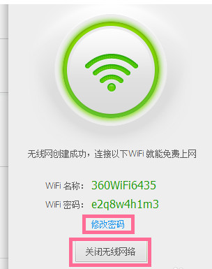 步骤五:如果你觉得360连我wifi提供的密码太过复杂可以点击“修改密码”修改成自己熟悉的密码。不想使用的时候点击“关闭无线网络”即可