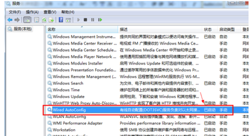 2、服务控制台中,找到, wired autoconfig 这个服务,查看是否已经启动。如果停止右键启动该服务