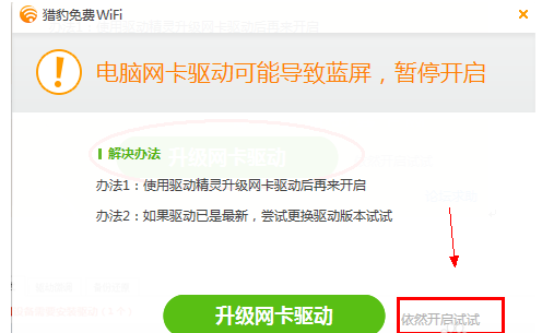 方法四:1、无线网卡驱动有问题 猎豹免费wifi校园神器下载安装好之后,不能启动提示“升级网卡驱动”,点击升级驱动,然后运行驱动精灵软件找到,“标准模式”里面查找驱动更新,注意 无线网卡一栏一定要更新,更新好驱动重启电脑
