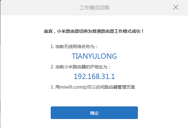 14.确定后路由一样会重启,至此,设置会普通路由模式完成,小米路由信号SSID变回原来的名字了,管理地址也改回原来的样子了的。