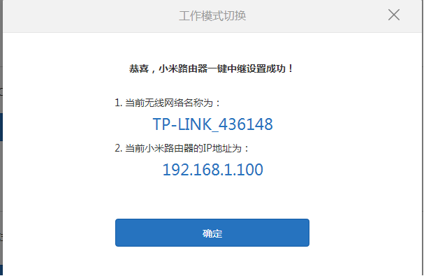 8.设置完后只需要点击“一键无线中继”稍微等待一下,小米路由就会自动为我们设置完成了的。完成后会提醒小米的无线信号已经变成了和中继信号的一样了,还有第二个很重要,一定要看清楚,也要记住,这个是小米路由中继模式后的管理地址,中继就没有办法用miwifi.com和192.168.1.1管理的了,我看论坛上很多人再问中继后怎么访问不了小米路由,管理路由了,要恢复出厂设置后重新设置,如果你不想这样,那么请你记住这个管理IP。