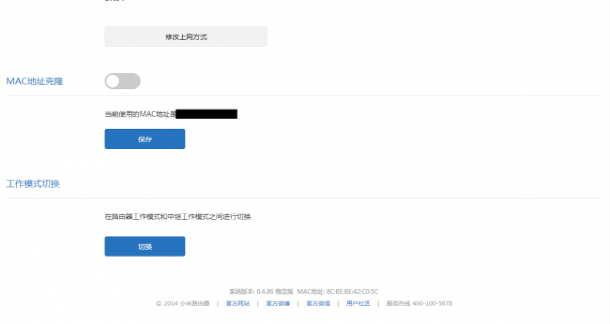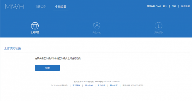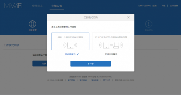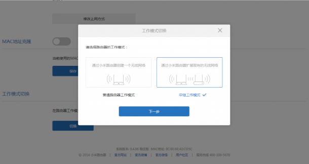 5.点击“切换”按钮,可以看到小米路由提供了两种选择:普通路由工作模式和中继工作模式,选择中继工作模式。