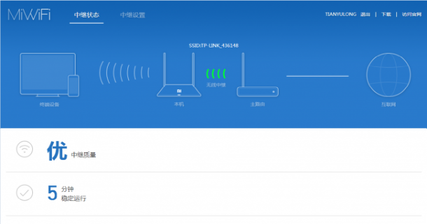 10.下面说下怎么恢复为原来的普通路由工作模式,这里就要用到上面提到要记住的管理IP了,在浏览器地址栏输入刚刚的管理IP,输入原来的管理密码,登陆进去,现在小米路由就是中继模式的管理页面了,没有了普通路由模式的测速了,连接的图片也不一样了。