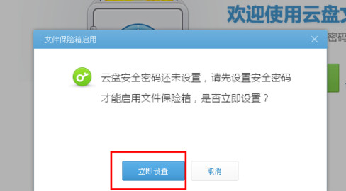 3、点击上一步骤图片中的“启用保险箱”按钮启用云盘保险箱,在弹出的对话框中询问您是否设置安全密码,当时要设置啦!点击“立即设置”按钮设置一下吧!
