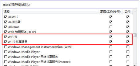 第四步:在打开的窗口中,分别勾选“WiFi宝”和“WiFi共享精灵”右侧的选项,以确保防火墙对这两个程序的允许访问。