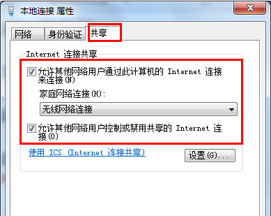 第二步:在打开的窗口中,切换至“共享”选项卡,勾选两项内容,并从“家庭网络连接”下拉列表中选择Wifi共享精灵所创建的无线连接。