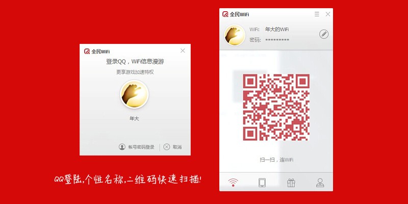 我们看到软件首页,发现电脑桌面会有个六边形的图标,整体占有桌面和其他WiFi相比更加小巧,主界面的交互简单明了。优先推荐登陆QQ账号,点击登录,你会发现这里和其他随身wifi不同,WiFi的账号则采用登陆QQ的昵称格式,密码默认格式为“q+QQ号码“,这样可以方便查找和管理。