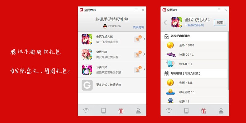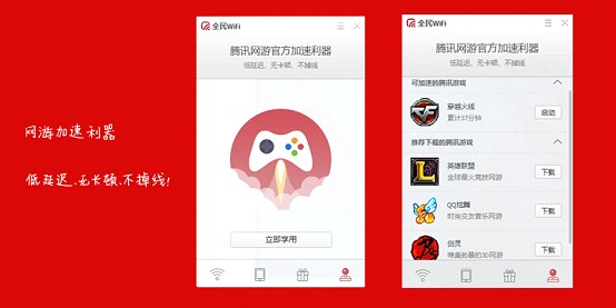 玩游戏的朋友这个是最喜欢,普通打开网游,可能会因为网速、设备等缘故所导致游戏登陆、加载连接缓慢甚至中途掉线退出的情况,而网游加速器是通过技术在系统底层截取网游程序发送和接收的数据包,并通过加速服务器对数据包进行运行的加速。大家会发现使用前后打开网游的速度以及在游戏过程中运行加载效果会出现明显的差别,而如今大部分网游加速器都需要官方下载,或者续费虚拟业务来满足游戏玩家的需求,现在可以一边设备连着WiFi,一边痛快的玩游戏,全民WiFi中的腾讯网游加速利器可以让游戏在运行中低延迟、无卡顿和不掉线哦!