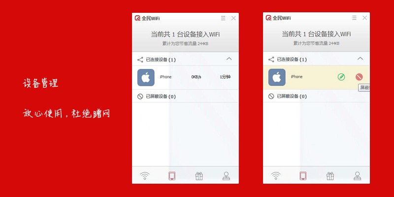 设备管理页面可以查看当前已经有多少设备接入WiFi,以及对已经连入的设备进行管理,可以添加设备的备注名和屏蔽设备(目前版本暂时不支持对设备的WiFi进行限速)