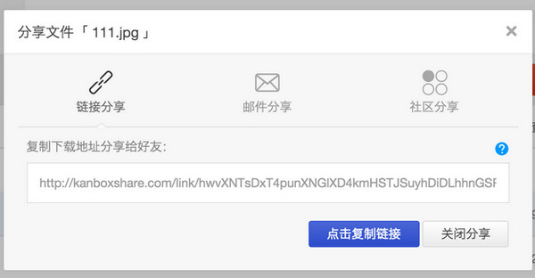 您可以直接复制链接发送给好友,也可以将链接分享到微博、人人网等。点击“关闭分享”后,该文件将不再对外共享。