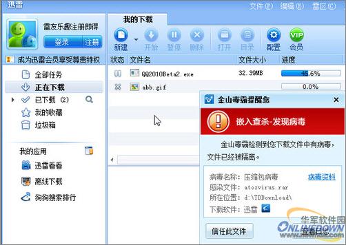 金山毒霸2011除查杀之外,在木马植入本地之前,包括下载过程中,也可将其瞬间将潜在威胁进行拦截和防护。新版同时支持和包括迅雷、快车、QQ旋风等软件进行嵌入查杀。下载含毒文件后,会自动对其进行检测。同步开启金山网盾,还可对各类挂马网站和钓鱼站点进行快速屏蔽。