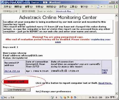 假如你的计算机不幸失窃,那么请立即访问http://www.absolute-protect.com/,点击页面上的“Report a theft”红色链接,如图4。在这里输入安装时输入的用户名、E-mail地址、失窃的时间等信息,最后点击页面底部的“Submit report”按钮提交给Absolute Protect公司。以后只要这台计算机链接到因特网,Advatrack Pro会按照事先设置的时间自动收集包括IP地址在内的信息发送到指定的邮箱,或者你也可以访问http://www.absolute-protect.com/页面进行在线查看,这下至少追踪有术了。
