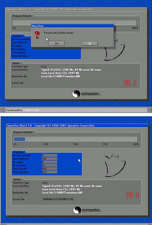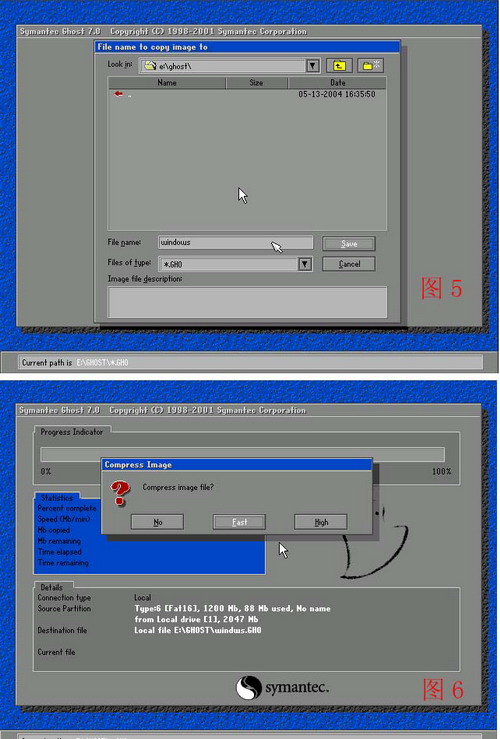 在弹出的窗口中选择备份储存的目录路径并输入备份文件名称,如图5,注意备份文件的名称带有GHO的后缀名。 接下来,程序会询问是否压缩备份数据,并给出3个选择:No表示不压缩,Fast表示压缩比例小而执行备份速度较快,High就是压缩比例高但执行备份速度相当慢。如图6。 最后选择Yes按钮即开始进行分区硬盘的备份。如图7。 Ghost备份的速度相当快,不用久等就可以完成,如图8。备份的文件以GHO后缀名储存在设定的目录中。