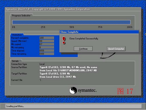 还原完成后,会有两个按钮,分别是继续与重启动计算机,默认的是重启,如图17,如果不进行其它操作重启即可。