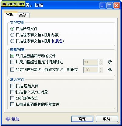 在安装完杀毒软件,井进行升一级后.通常我们会进行一次全盘扫描,建议修改扫猫范围,以加快重复复扫描速度。具体方法是:同样打开“设置”窗口。在 左侧任务栏表中选择“扫描”项. 单击自定义按钮,在打开窗中。选择“扫描程序和文档(根据内容)”项,勾选“仅扫描新建的和已更改的文件”。如果用户不需要“扫描压缩文件”或者“扫描嵌入式OLE对象”,可以去掉选择“复合文件”项中的对应设置,最后单击“确定”按钮即可。