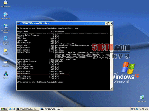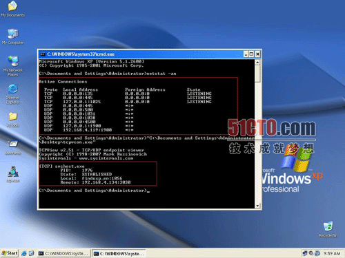 上图是使用Tasklist/svc的显示结果,/svc参数是显示进程和服务的对应关系。红框内的svchost.exe就是可疑进程,它启动了一个名为zzxrubbr的服务。顺便说一句,如果发信目标恶意软件不是安装成服务,而是独立的一个进程,用户可以使用taskkilltarget/force命令从内存中杀掉恶意软件的进程。