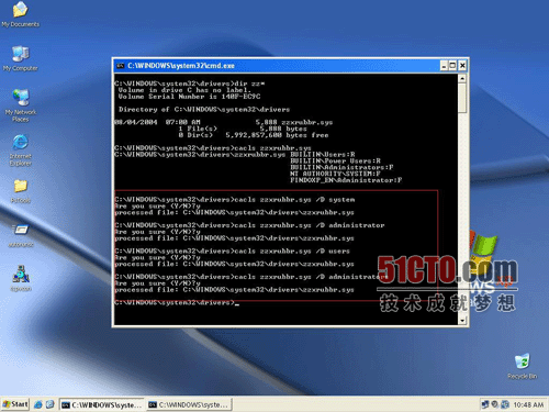 3)修改权限法,是恶意软件清除操作中最后也是最有效的一招,多用于无法删除和重命名目标恶意软件的场合,使用修改权限法,还可以对目标恶意软件进行免疫。重启后,目标恶意软件因为没有执行权限无法启动,达到清除目的:
